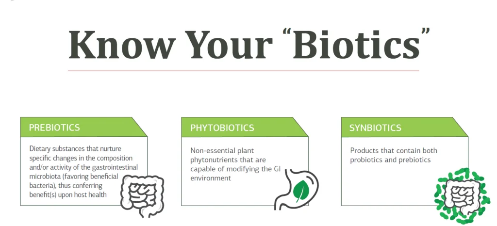 Prebiotics, probiotics, synbiotics, phytobiotics, psychobiotics, parabiotics, and postbiotics explained.