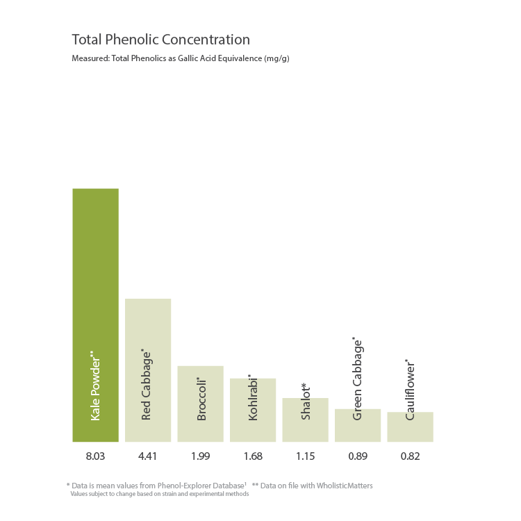 Kale (Brassica oleracea var. viridis L) is a cruciferous vegetable associated with production of detoxification enzymes, antioxidant properties, cardiovascular protection, and anti-carcinogenic activity. Kale is a staple vegetable in healthy diets that contain glucosinolates and a concentrated punch of essential nutrients.