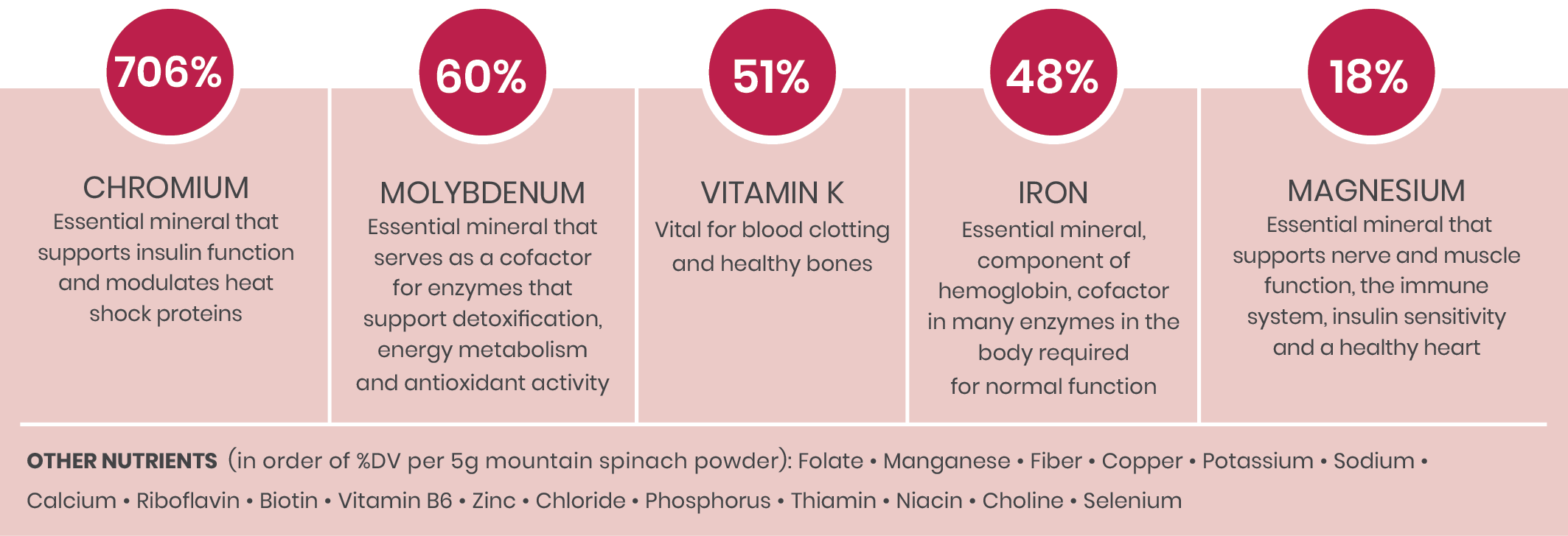 Percentages shown as %DV per serving of 5g mountain spinach powder