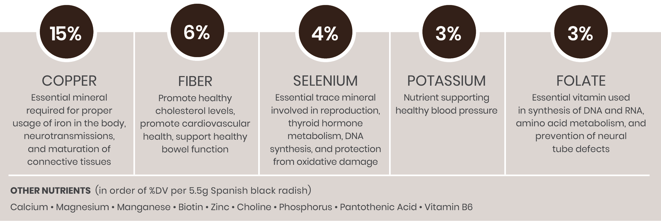 Percentages shown as %DV per serving of 5.5g Spanish black radish.