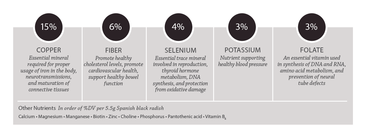 Percentages shown as %DV per serving of 5.5g Spanish black radish.
